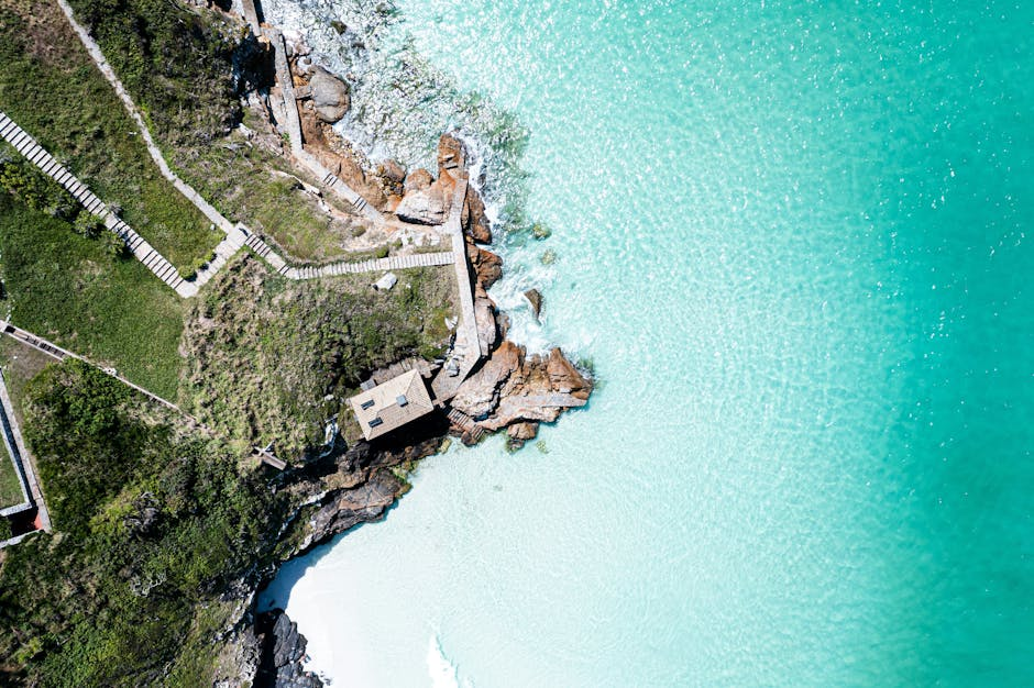 那個形狀是天然的嗎?不是,是以前漁民用來捕魚的設施,利用潮汐把魚困住。但因為形狀太美,現在變成觀光景點。最佳拍攝點在上面的觀景台,走上去大概五分鐘,有階梯。我去的那天天氣超好,海是那種深淺漸層的藍綠色,石滬的形狀清清楚楚,拍起來根本不用修圖。